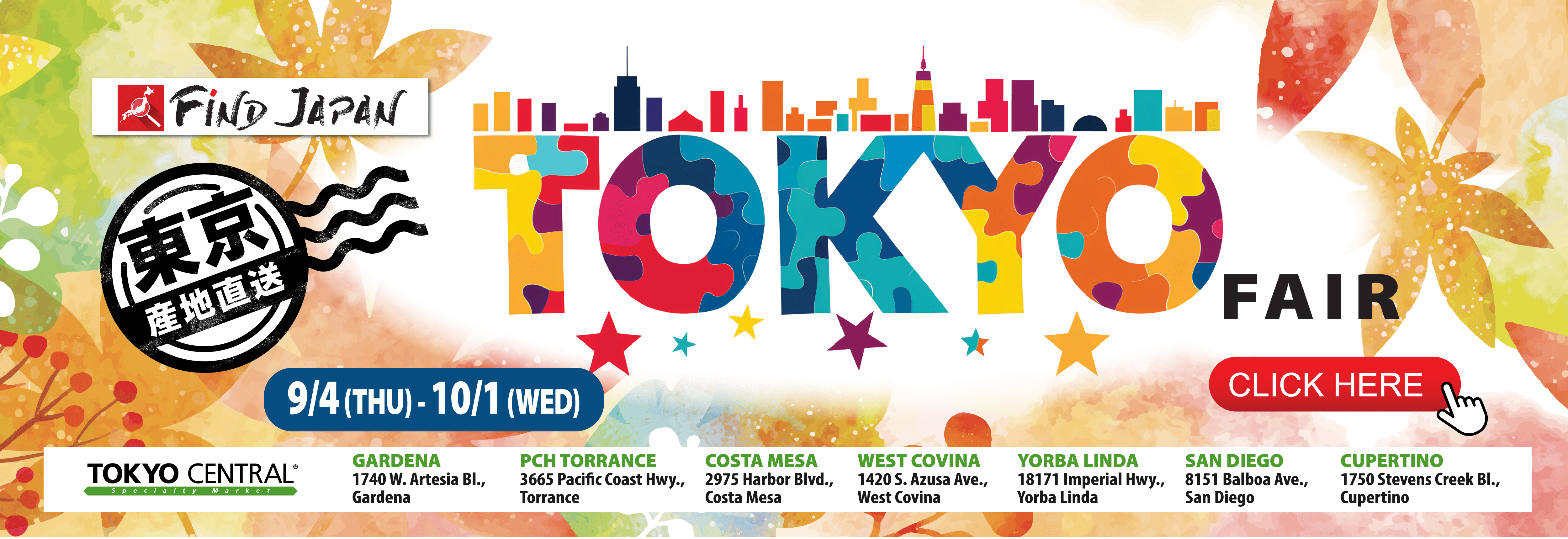 ガーデナ、PCHトーランス、コスタメサ、ウェストコビナ、ヨーバリンダ、サンディエゴ、クパチーノの東京セントラル7店にて、東京フェアを 9/4 (木) 〜 10/1 (水) に開催します。